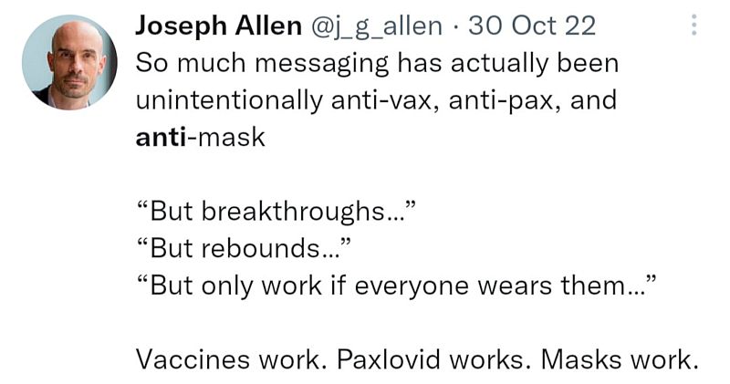Auch heute noch hausieren «Gelehrte» wie Joseph Allen von der Harvard T.H. Chan School of Public Health mit ihren Masken-, Paxlovid- und Impfstoffnarrativen und versuchen, jeden zum Schweigen zu bringen, der mutig genug ist, empirische Gegenargumente vorzubringen.