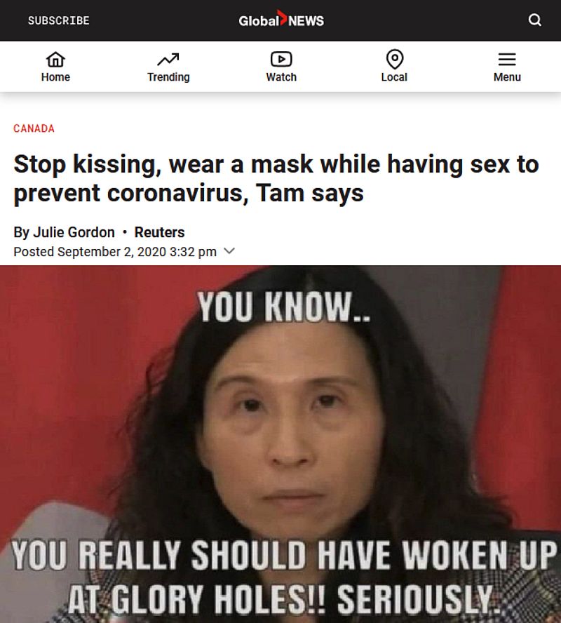 Und dann gibt es noch Gesundheitsbeamte wie Dr. Theresa Tam, die die Grenzen auf ein neues Niveau heben. Sie predigen Masken selbst in den intimsten Momenten und befürworten Glory Holes als pandemiesichere Lösung für fleischliche Begierden.