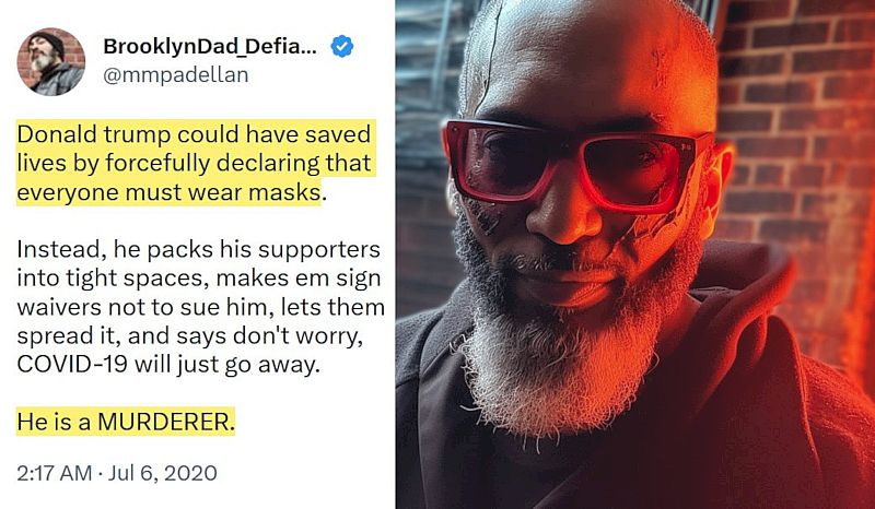 Auch Infaulenzer Influencer wie BrooklynDad_Defiant! der über keinerlei Fachwissen verfügt, fordern, dass jeder zwangsweise eine Maske tragen sollte. Er ging sogar so weit, dass er Donald Trump als Mörder bezeichnete, weil er das Maskentragen der persönlichen Entscheidung überlässt.