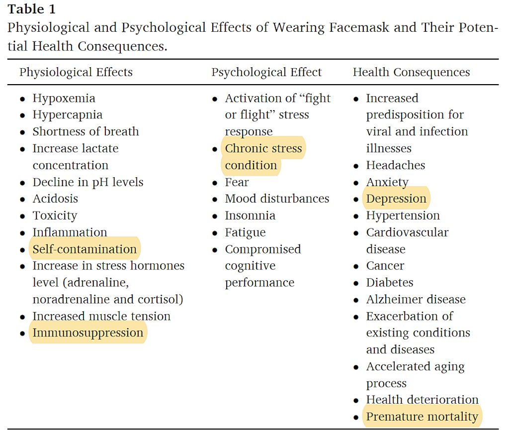 Hast du schon einmal über die physiologischen und psychologischen Auswirkungen von Masken nachgedacht? Selbstkontamination, Immunsuppression, chronischer Stress und Depression. Ein hoher Cortisolspiegel führt zu vorzeitiger Sterblichkeit. Und doch wurde diese «Behandlung» verschrieben!