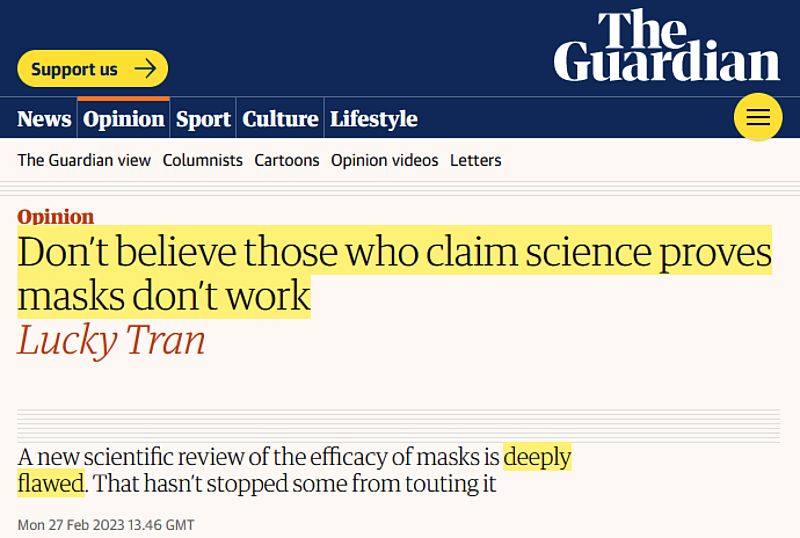 Dann gibt es noch Journalisten wie Dr. Lucky Tran von The Guardian die die Menschen auffordern, die Ergebnisse des Cochrane-Reviews zur Wirksamkeit von Masken zu ignorieren. Fehlinformationen werden weiterhin verbreitet, obwohl die Regierungen auf der ganzen Welt langsam zur Wahrheit stehen.