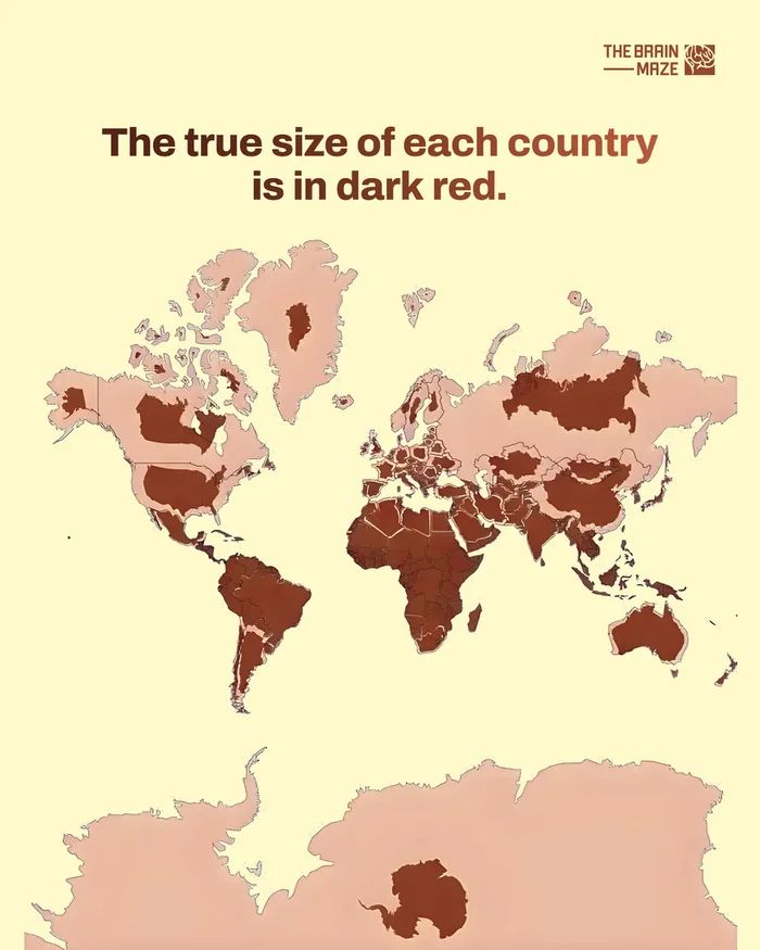 Eine andere Karte (siehe Grafik) zeigt in dunkelrot die tatsächliche Grösse der Länder auf einem realitätsnahen Globus. Das Ergebnis ist augenöffnend: