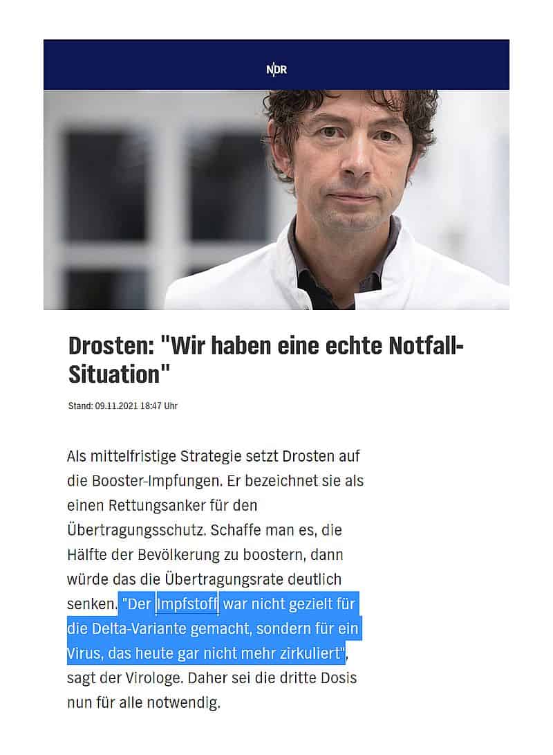 Das sogenannte «Boostern» ist in aller Munde und damit ist die 3. Impfung gemeint, welche sich die Bevölkerung gemäss Politik und Presse verpassen lassen soll. Und nun präzisiert ausgerechnet der deutsche Chefvirologe die aktuelle Situation und erwähnt, was jeder Mensch der noch einigermassen bei Verstand ist schon lange weiss, der Impfstoff, welcher aktuell für die Drittimpfung verwendet wird, wurde für ein Virus gemacht, das heute nicht mehr zirkuliert…