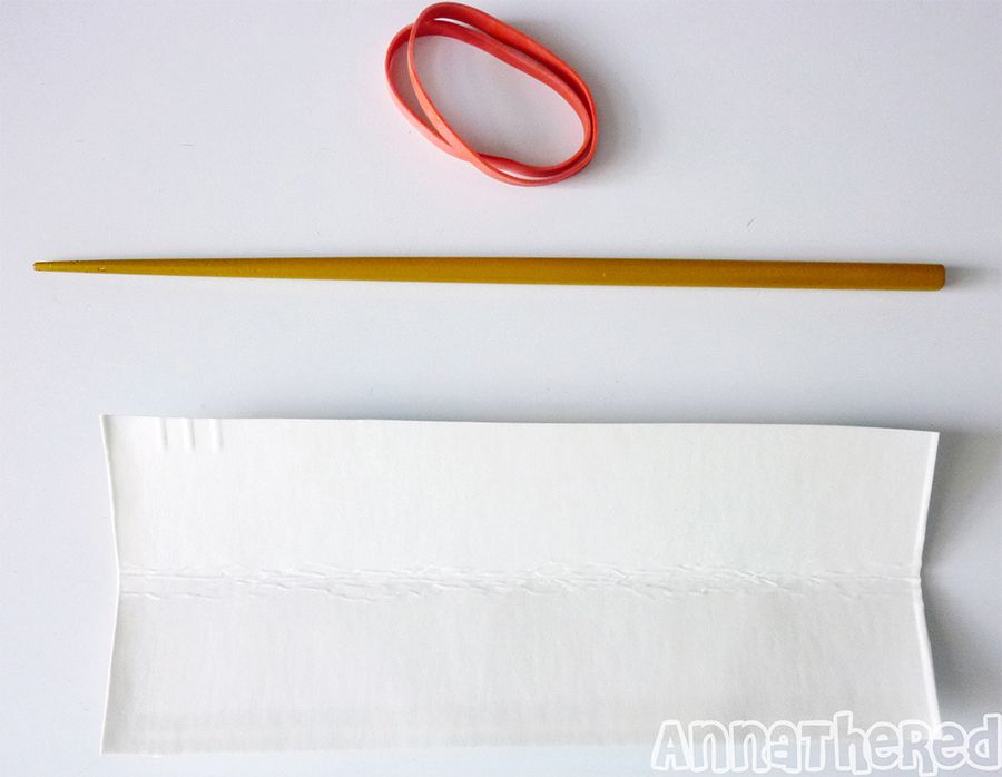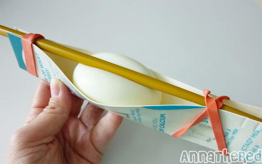 Schritt 2: Während das Ei noch warm ist, es zum ziehen lassen in den Falz des Milchkartons legen und ein Stäbchen in der Mitte des Ei’s mit Gummibänder an den beiden Enden fixieren.