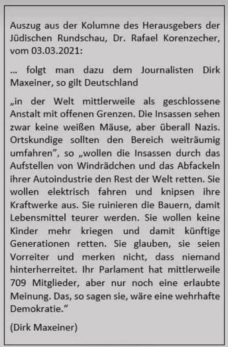 «in der Welt mittlerweile als geschlossene Anstalt mit offenen Grenzen. Die Insassen sehen zwar keine weissen Mause, aber überall Nazis. Ortskundige sollten den Bereich weiträumig umfahren», so «wollen die Insassen durch das Aufstellen von Windrädchen und das Abfackeln ihrer Autoindustrie den Rest der Welt retten. Sie wollen elektrisch fahren und knipsen ihre Kraftwerke aus. Sie ruinieren die Bauern, damit Lebensmittel teurer werden. Sie wollen keine Kinder mehr kriegen und damit künftige Generationen retten. Sie glauben, sie seien Vorreiter und merken nicht, dass niemand hinterherreitet. Ihr Parlament hat mittlerweile 709 Mitglieder, aber nur noch eine erlaubte Meinung. Das, so sagen sie, wäre eine wehrhafte Demokratie.»