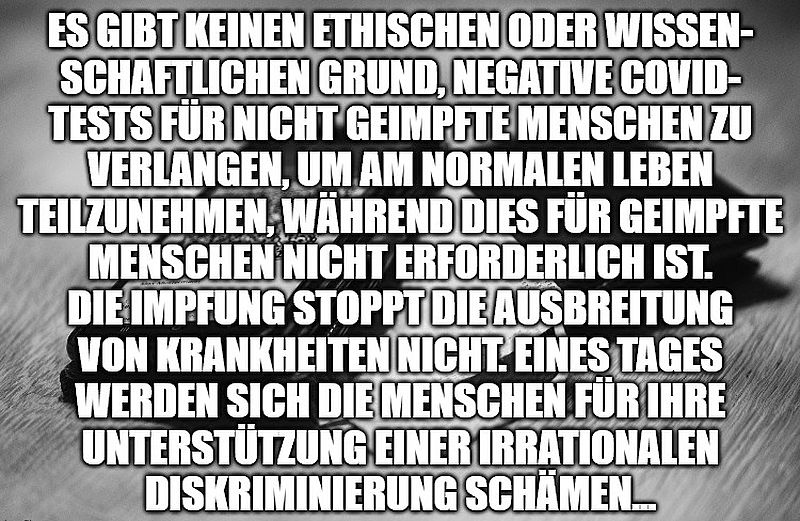Es gibt keinen ethischen oder wissenschaftlichen Grund, negative Covid-Tests für nicht geimpfte Menschen zu verlangen, um am normalen Leben teilzunehmen, während dies für geimpfte Menschen nicht erforderlich ist. Die Impfung stoppt die Ausbreitung von Krankheiten nicht. Eines Tages werden sich die Menschen für ihre Unterstützung einer irrationalen Diskriminierung schämen…