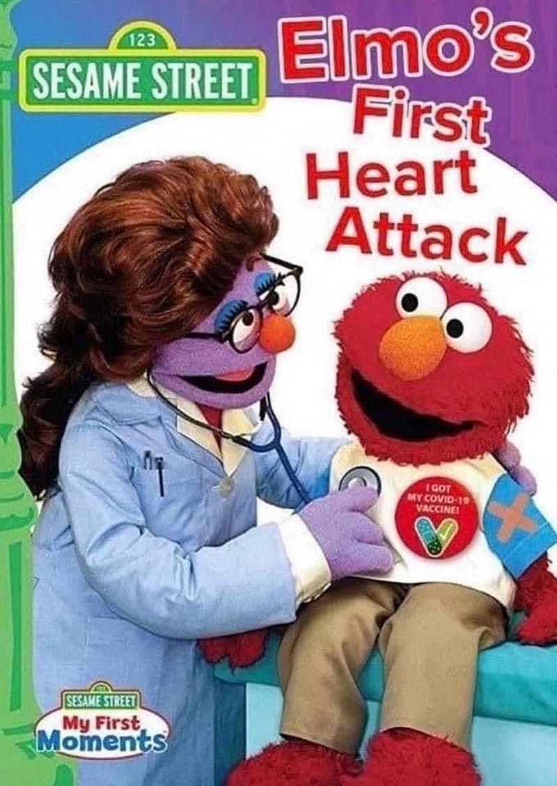 Diese Impfpropaganda wird immer unerträglicher, nun zeigt Elmo seine «Superhelden»-Verbände, nachdem er den COVID-19-Impfstoff bekommen hat.