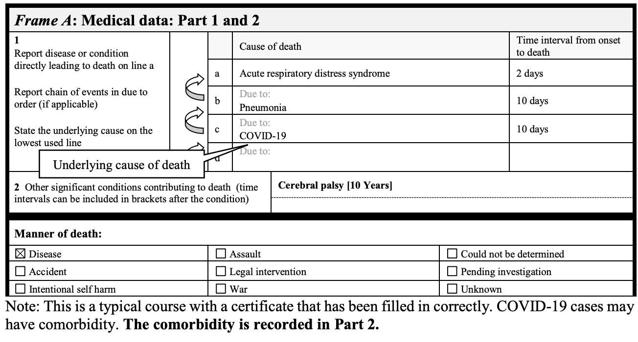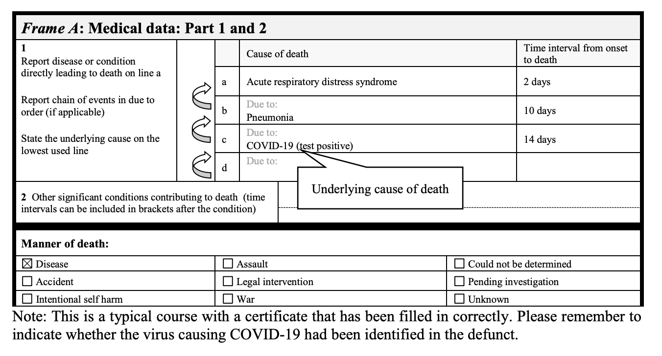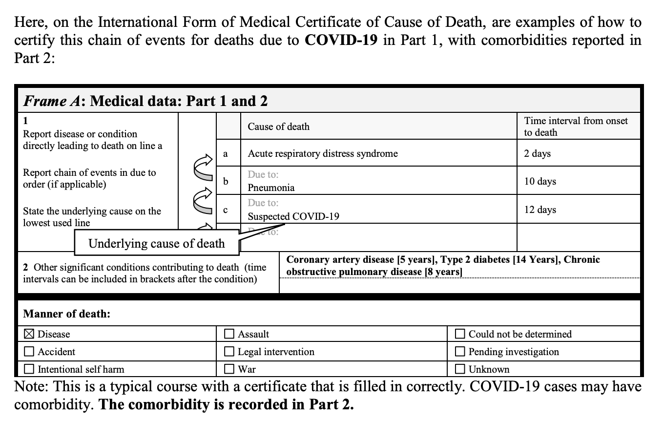 Das obige Beispiel dokumentiert, dass trotz der Tatsache, dass dieser Patient eine koronare Herzkrankheit, Typ-2-Diabetes und COP hatte, die WHO empfiehlt, auf dem Totenschein COVID-19 als primäre Todesursache anzugeben. Auch ohne positiven Test.