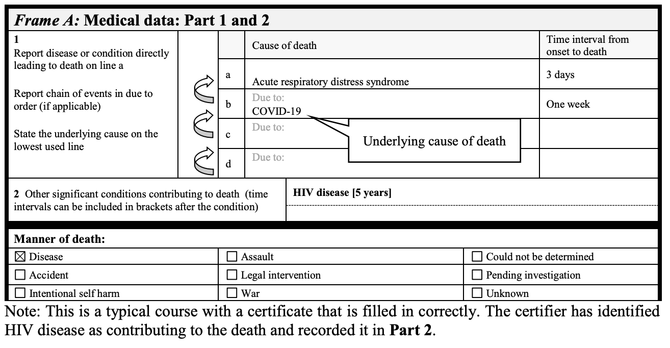 Die internationalen Regeln und Leitlinien für die Auswahl der zugrundeliegenden Todesursache für die statistische Auswertung finden Anwendung, wenn COVID-19 auf einer Sterbeurkunde gemeldet wird, aber angesichts der hohen Anforderungen des öffentlichen Gesundheitswesens an die Daten wird COVID-19 nicht als Folge oder offensichtliche Konsequenz von etwas anderem betrachtet, analog zu den Kodierungsregeln, die für INFLUENZA gelten. Darüber hinaus gibt es in der Klassifikation keine Möglichkeit, COVID-19 mit anderen Ursachen in Verbindung zu bringen oder seine Kodierung in irgendeiner Weise zu ändern.