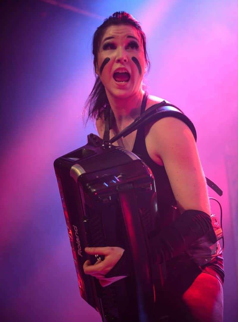 Nach einer kurzn Umbaupause hüllte sich die Bühne in rotes Licht und Ensiferum betraten nacheinander umjubelt die Bretter die die Welt bedeuten. Diesmal war das finnische Akkordeonwunder Netta Skog mit dabei, die ja einst bei «Turisas» in die Tasten griff und auf dieser Tour Emmi Silvennoinen ersetzte. Schon bei den Klängen des Openers «March Of War» ging das Publikum bereits steil ab und daran änderte sich dann im Verlauf des Abends rein gar nichts mehr. Sowohl die neuen Titel wie «March Of War», «Axe Of Judgment», «Heathen Horde» oder «One Man Army», als auch die ältere Stücke wie «Into Battle», «Ahti» oder «Victory Song» zündeten voll und im Zuschauerraum wurde gesungen, geklatscht, gebangt, gemosht und natürlich auch getrunken als gäbe es kein Morgen. Und auch auf der Bühne war wie immer jede Menge Bewegung: Gitarrist Markus Toivonen und der ständig Grimassen schneidende Sami Hinkka stürmten fast ständig über die Bühne, wenn sie nicht gerade den Hintergrundchor geben mussten.