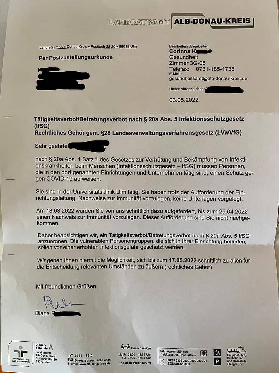 Vor weit über einem Jahr sagte ich «2022 wird das Jahr der Entscheidungen». So ist es auch und zwar in vielfältiger Weise. Hier ist ein Arzt, der jetzt solch eine Entscheidung zu treffen hat. Er bekam folgendes Schreiben, erinnert mich an die guten deutschen Traditionen «Berufsverbot wegen extremistischer Einstellung».