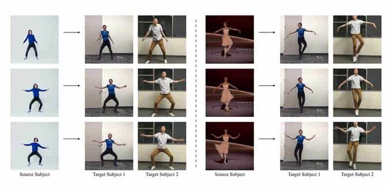 This paper presents a simple method for ‚do as I do‘ motion transfer: given a source video of a person dancing we can transfer that performance to a novel (amateur) target after only a few minutes of the target subject performing standard moves. We pose this problem as a per-frame image-to-image translation with spatio-temporal smoothing. Using pose detections as an intermediate representation between source and target, we learn a mapping from pose images to a target subject’s appearance. We adapt this setup for temporally coherent video generation including realistic face synthesis.