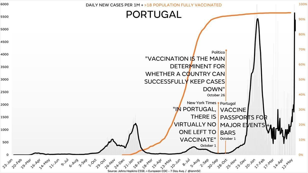Aktuell hat Portugal, wo ~98 % der Erwachsenen vollständig geimpft sind, die höchste Fallrate der Welt und die höchste Fallrate seit Beginn der Aufzeichnungen. Und dies zu einem Zeitpunkt, zu dem Coronaviren gar keine Saison haben. Vielleicht wird nun endlich auch der leichtgläubigste und obrigkeitshörigste Bürger etwas tiefgründiger und denkt vielleicht selbst mal darüber nach, woran das wohl liegen könnte und ob man ihm die letzten 2 Jahre womöglich doch nicht immer die Wahrheit gesagt hat.