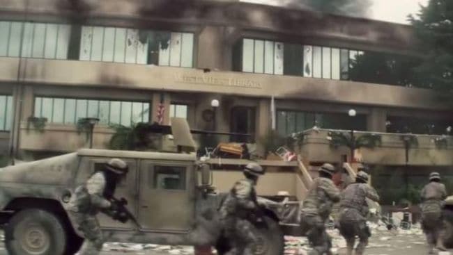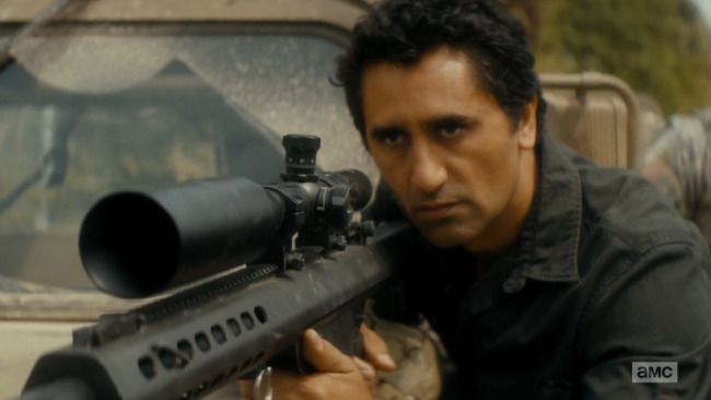 Travis versucht, über Oberbefehlshaber Moyers an Informationen zu kommen und schafft es schliesslich, mit den Soldaten loszufahren, um zu dem Krankenhaus zu gelangen. Doch auf dem Weg dahin wird die Truppe zwei Mal gestoppt: Moyers zwingt Travis durch das Fernrohr eines .50 Caliber Scharfschützengewehrs zu blicken und einen Zombie zu töten. Der bisher gutgläubige und naive Travis hadert mit der Herausforderung und kann sich am Ende nicht dazu durchringen. Schliesslich ist er eher friedliebend und wenn er einer gewaltsamen Auseinandersetzung aus dem Weg gehen kann, tut er das auch. Der interessante Aspekt der Figur ist, dass Travis inzwischen durchaus begreifen mag, dass die Kellnerin namens Kimberley nicht mehr zu retten ist und wahrscheinlich sogar erlöst werden sollte. Er selbst kann sich jedoch einfach nicht zu diesem Schritt durchringen. Ob Travis‘ Pazifismus tiefgehende Gründe hat, wird sich noch zeigen. Während sich aber seine Frau sogar recht schnell mit Daniels Foltermethoden anfreunden kann, ist es doch beruhigend, dass mit Travis auch eine komplizierte Figur mit der Situation hadern darf, die als nicht völlig unschuldig idealisiert wird. Beim zweiten Mal halten die Soldaten an einer Bücherei an, die anscheinend voller Infizierter ist. Während es innen zu heftigen Szenen kommt, wobei einige Soldaten auch den Tod finden, wartet Travis draussen im Wagen, bis die Soldaten schliesslich völlig entsetzt zurückkehren und beschliessen, zu ihrer eigenen Sicherheit zur Schutzzone zurückzufahren.