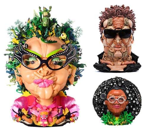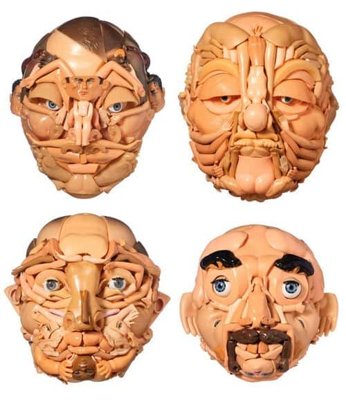 Freya Jobbins macht aus altem Spielzeug neue Kunst. Der südafrikanische Künstlerin, welche heute in Autralien lebt fertigt aus Puppenteilen neue Gesichter, die sowohl an Frankenstein als auch an die berühmten Werke des Spätrenaissance-Malers Giuseppe Arcimboldo erinnern. So bastelt sie aus zerstückelten Blondinen und muskulösen Plastikmännern monströse Gesichter und die irritierenden Köpfe sind alles Unikate. Auch aus Ninja-Turtles und Autoreifen lassen sich eigenwillige Frisuren kreieren und auf einem anderen Kopf nisten Spongebob, Dinosaurier und Schlangen. Auch Batman sieht aus, als hätte er eine Botox-Behandlung hinter sich, was bei soviel Barbie-DNA auch nicht weiter verwundert.