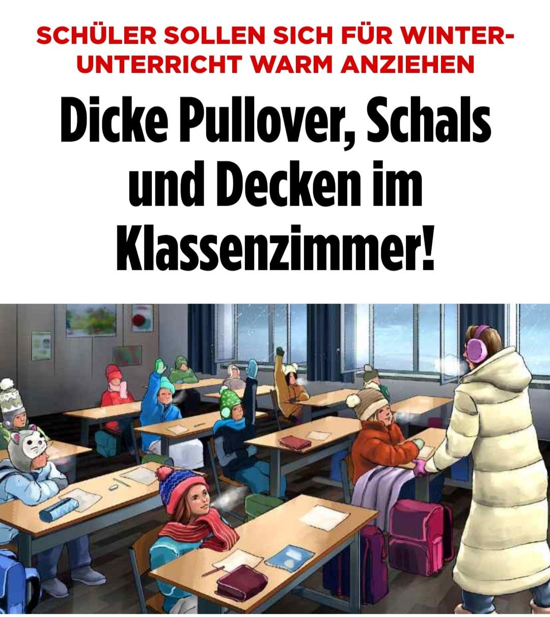 Handschuhe und vor allem Ohrenschützer… so wichtig im Unterricht! Gerade für die Kleinen in den ersten Klassen, die in der Regel um kurz nach 06:00 Uhr sowieso viel zu früh geweckt werden. In fluffige Decken eingehüllt sassen sie schon die letzten beiden Winter da – damals für den Covidianismus. Nun also der nahtlose Übergang vom Frieren gegen Corona zu Frieren fürs Klima und >gegen< den Frieden. Gut eingeübt. Die Indoktrinierung muss schliesslich fortgesetzt werden, komme, was da wolle... 👍🏼 Frieren gegen den Frieden