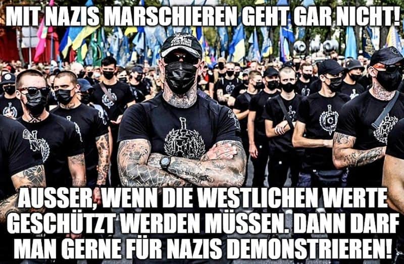 Mit Nazis marschieren geht gar nicht! Ausser wenn die westlichen Werte geschützt werden müssen. Dann darf man gerne FÜR Nazis demonstrieren!