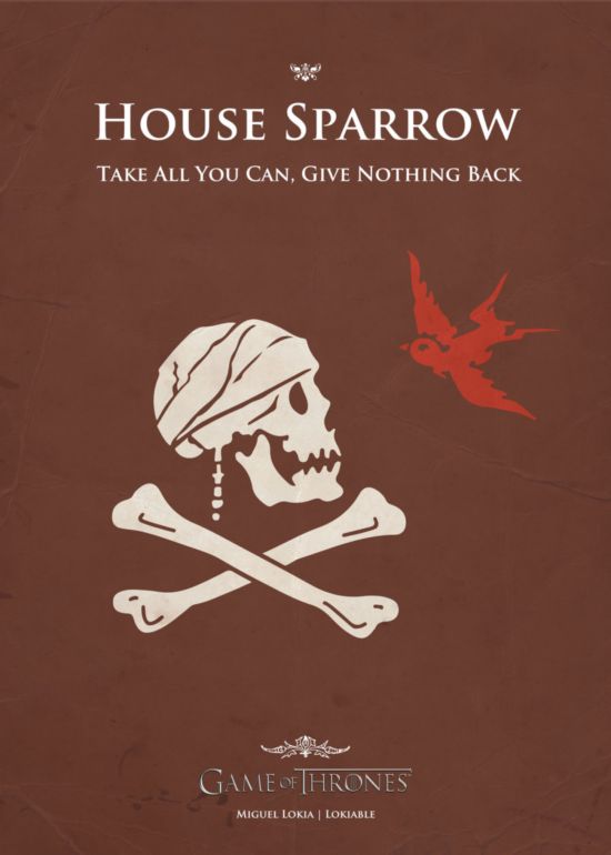 Künstler und Deviantart Nutzer Lokiable hat sich durch die verschiedene Familien Banner aus Game of Thrones inspirieren lassen und Familien Wappen für Figuren der Popkultur kreiert, die hervorragend in das Game of Thrones Universum passen.