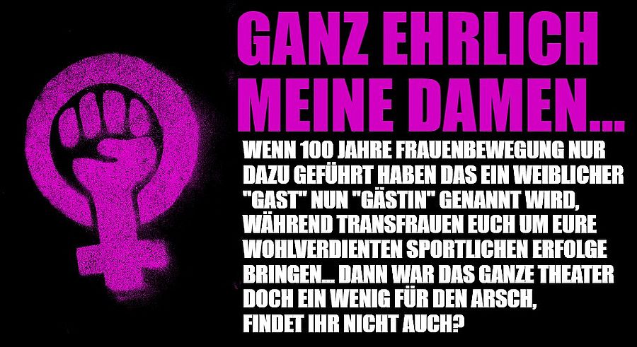 Wenn 100 Jahre Frauenbewegung nur dazu geführt haben das ein weiblicher «Gast» nun «Gästin» genannt wird, während Transfrauen euch um eure wohlverdienten sportlichen Erfolge bringen… Dann war das ganze Theater doch ein wenig für den Arsch, findet ihr nicht auch?