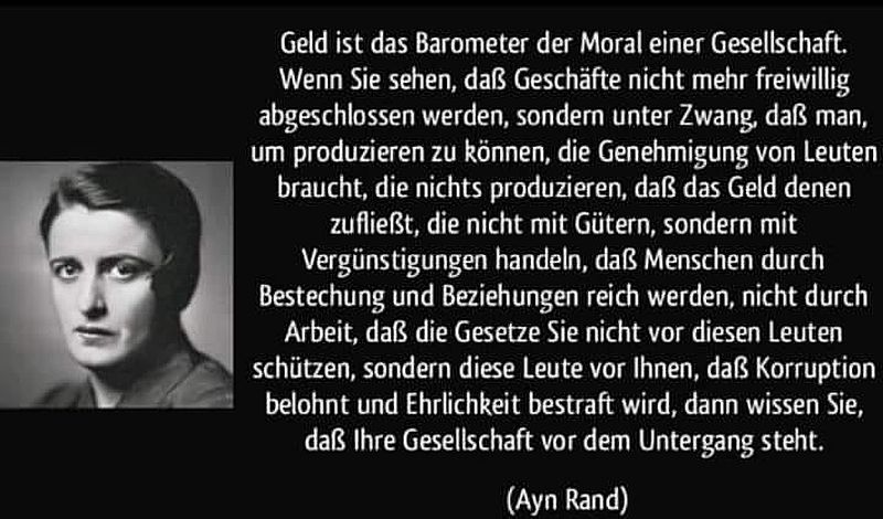 Geld ist das Barometer der Moral einer Gesellschaft. Wenn Sie sehen, dass Geschäfte nicht mehr freiwillig abgeschlossen werden, sondern unter Zwang, dass man, um produzieren zu können, die Genehmigung von Leuten braucht, die nichts produzieren, dass das Geld denen zufliesst, die nicht mit Gütern, sondern mit Vergünstigungen handeln, dass Menschen durch Bestechung und Beziehungen reich werden, nicht durch Arbeit, dass die Gesetze Sie nicht vor diesen Leuten schützen, sondern diese Leute vor Ihnen, dass Korruption belohnt und Ehrlichkeit bestraft wird, dann wissen Sie, dass Ihre Gesellschaft vor dem Untergang steht.