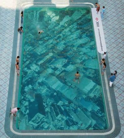 Dies hier ist eine Anzeige für eine Bank in Indien. Sieht so aus, also ob der Bank in der Finanzkrise das Wasser nicht nur bis zum Hals, sondern bis in den 50. Stock steht. Tatsächlich will die Bank auf die Folgen des Klimawandels hinweisen, wie man hier nachlesen kann.