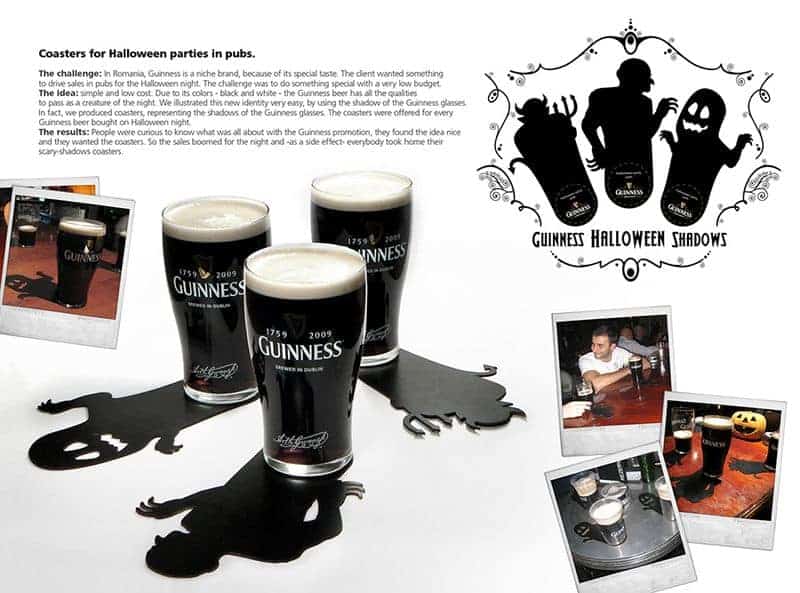 Die irische Biermarke Guinness hat es in Rumänien nicht leicht, Fuss zu fassen. Das liegt an dem aussergewöhnlichen und einzigartigen Geschmack, der durch das Zapfen mit Kohlensäure und Stickstoff zustande kommt. Um die Rumänen von dem Geschmackserlebnis zu überzeugen, suchte ein Barbesitzer nach einer kostengünstigen Werbe-Idee für Halloween. Mit der Hilfe von Tempo Advertising aus Bukarest wurden diese Untersetzer entwickelt, die wie die Faust aufs Auge passen. Denn die dunkle Farbe des Guinness war wie gemacht für gruselige Schattenmonster. Das sorgte für Aufmerksamkeit und an der Bar wurde vermehrt das irische Bier geordert, weil jeder scharf auf die Untersetzer war, die man natürlich mit nach Hause nehmen durfte.