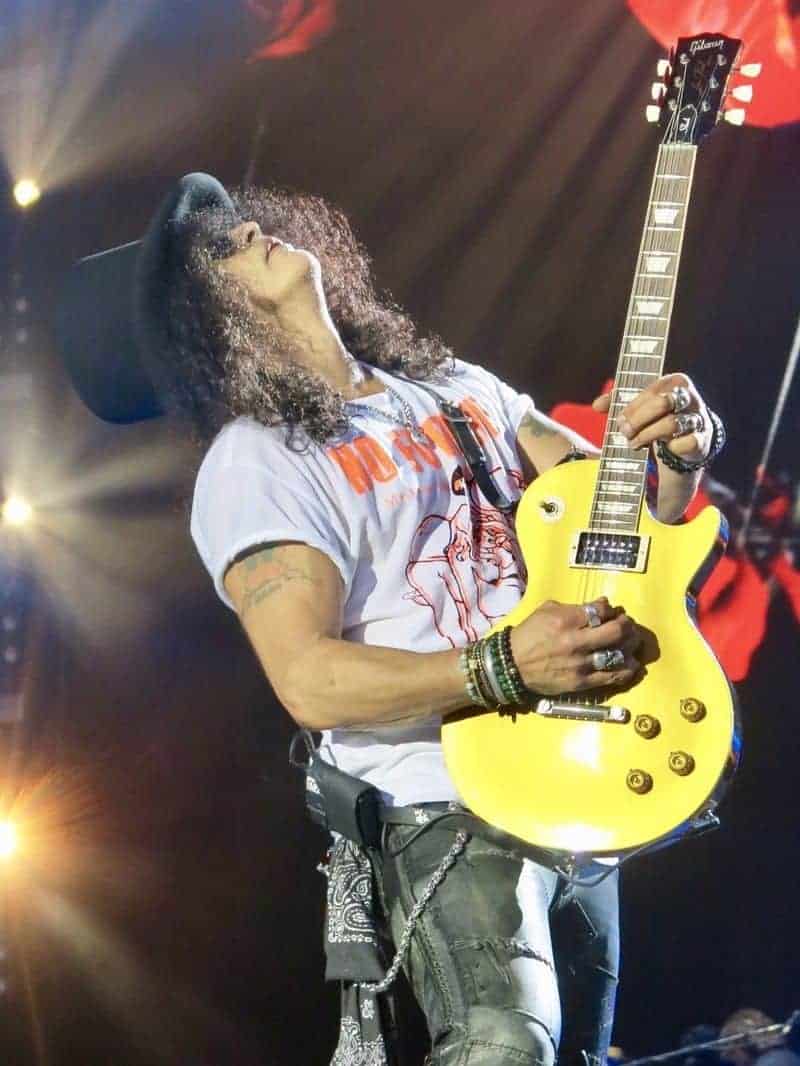 So sinkt im Verlauf des Konzerts allmählich die Freude über die Rückkehr der Band. Axl wechselte Lederjacken, Shirts und Hüte mehr, als es vermutlich Lady Gaga oder Madonna je getan haben, Mega-Oversize-Ringe funkeln an seinen Händen und als er die Sonnenbrille ablegt, zeigt sich, dass er Kajal trägt. Dass es Axl auch mit über 50 Jahren immer noch drauf hat, hat er bei seinem Gastspiel als Sänger von AC/DC bereits letzten Sommer eindrücklich bewiesen. Für die 120 Franken Eintritt müssen auch Rocklegenden wie Guns N’ Roses mehr bieten als nur Musik und so leuchteten Totenschädel, Graffiti, Rauch und Rockstars in Überlebensgrösse auf drei riesigen Screens und immer wieder knallte das Feuerwerk. Für das Material braucht es 24 Trucks, die direkt neben dem Stadion parkiert waren. Mammut-Tour und ein paar Wohlstandskilos zum Trotz sind die Herren in Topform. Axl sprintet rum, flucht so oft er kann und zeigte bereits im ersten Song den Mittelfinger. Slash kann noch immer tief in die Knie gehen und spielt seine Soli am vordersten Rand der Bühne, in jedem Song und minutenlang, was Axl für kurze Verschnaufspausen und besagte Kleiderwechsel nutzte.