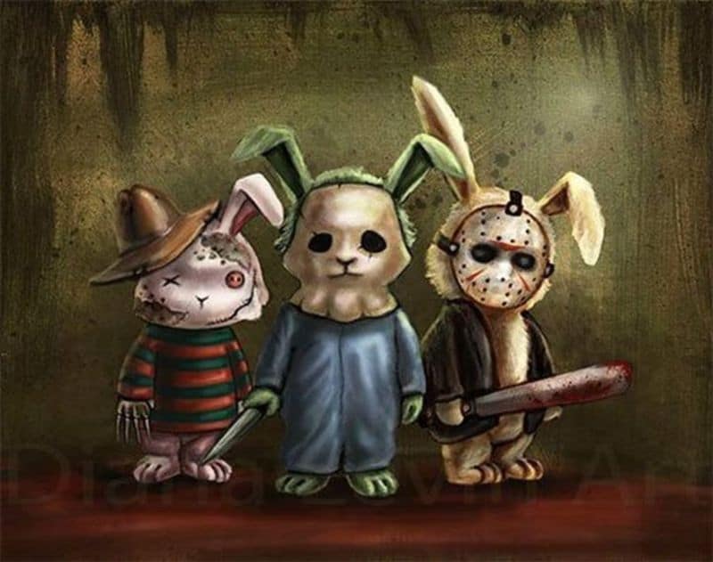 Vorsicht Freunde, die Osterhasen sind wieder unterwegs und hacken verstecken die Eier! Karten dieser flauschigen Horror Hasen hatte Diana Levin in ihrem Etsy Shop, leider sind die Teile ausverkauft…