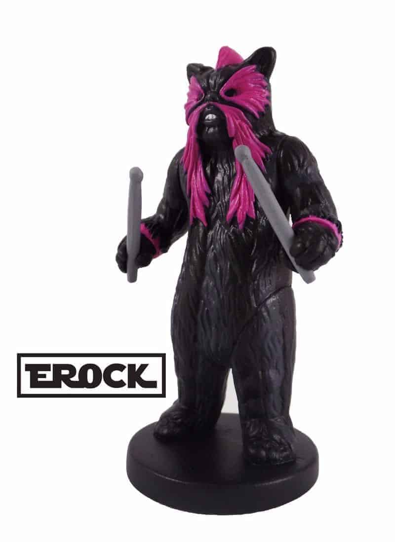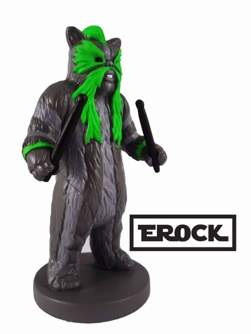 «Erock» is based off an original Kenner Logray Ewok. His tribal skills have evolved into playing drums for a metal band. […] He also comes with some attitude.