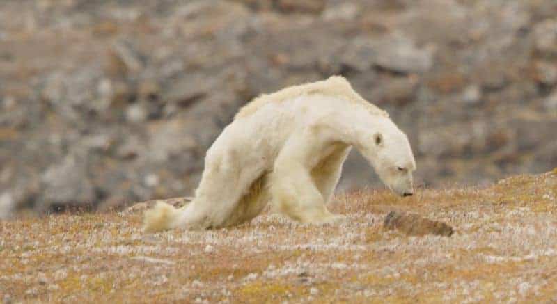 Nicklen sind Bären nicht fremd, seit seiner Kindheit im hohen Norden Kanadas hat der Biologe und Tierfotograf über 3000 Bären in freier Wildbahn gesehen. Aber der ausgemergelte Eisbär, der in dem Video zu sehen ist, das Nicklen am 5. Dezember in den sozialen Medien veröffentlichte, war einer der schlimmsten Anblicke, die er jemals gesehen hat. «Wir standen weinend da und filmten mit Tränen auf unseren Wangen», sagte er. Das Video zeigt einen Eisbären, der sich an das Leben klammert, sein weisses Haar bedeckt schlaff den dünnen, knochigen Körper. Eines der Hinterbeine zieht der Bär hinter sich her, wahrscheinlich aufgrund von Muskelschwund. Auf der Suche nach Nahrung stöbert der Eisbär langsam durch eine nahe gelegene Mülltonne, die saisonal von Inuit-Fischern benutzt wird. Er findet nichts und stürzt resigniert zurück auf den Boden.