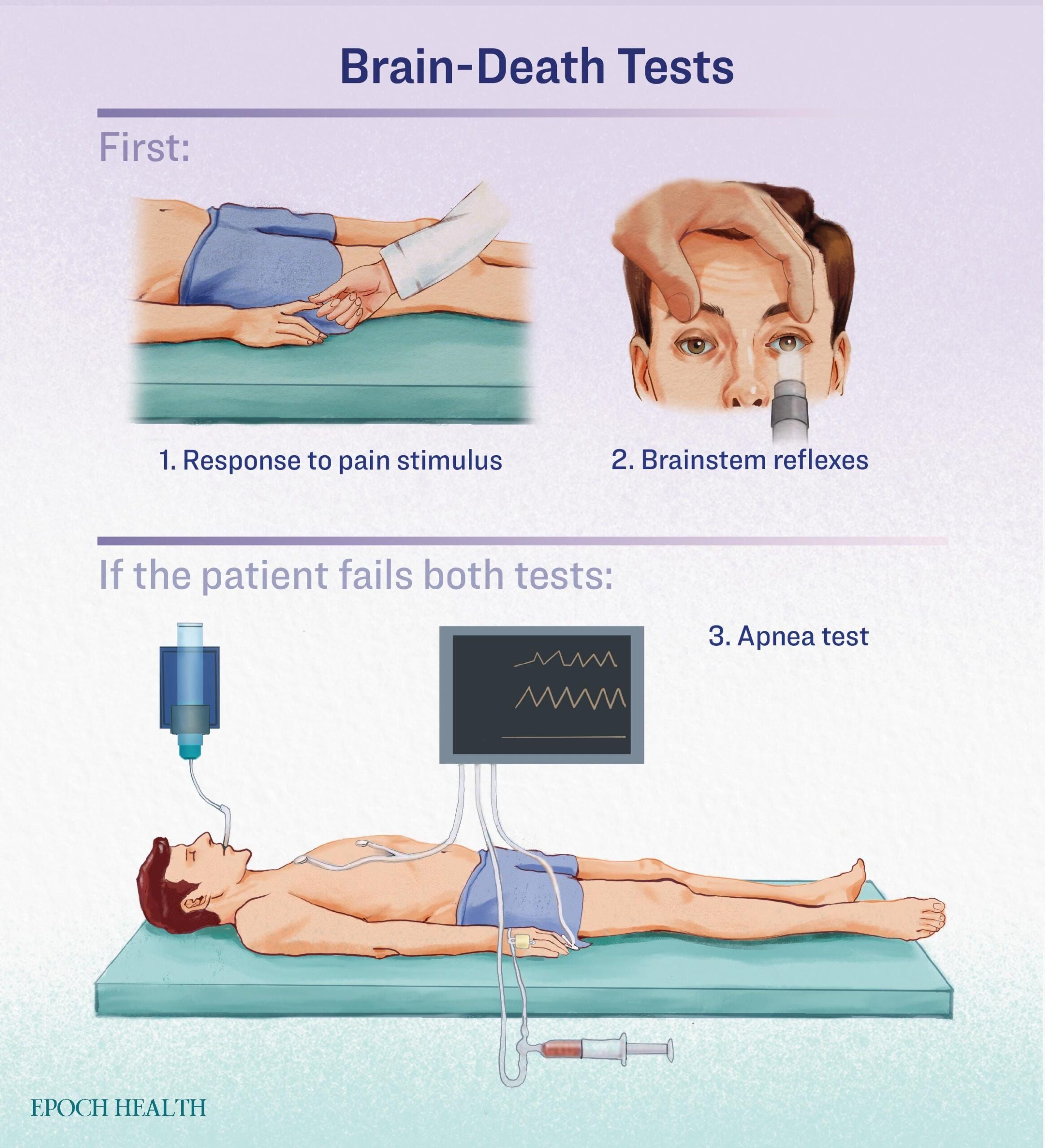 Nachdem die Hirnverletzung bestätigt wurde, führen zwei Ärzte die Hirntoduntersuchung durch. Der Patient wird zweimal auf seine Reaktionsfähigkeit auf Schmerzreize und Hirnstammreflexe getestet, wobei zwischen den einzelnen Tests ein Abstand von 24 Stunden liegt. Fällt der Test beide Male positiv aus, führen die Ärzte einen Apnoe-Test durch – der als aussagekräftigster Test gilt – um festzustellen, ob die Person ihre Atemreflexe verloren hat. Bei Kindern werden zwei Apnoe-Tests durchgeführt, einer nach jeder Untersuchung des Hirntods am Krankenbett.