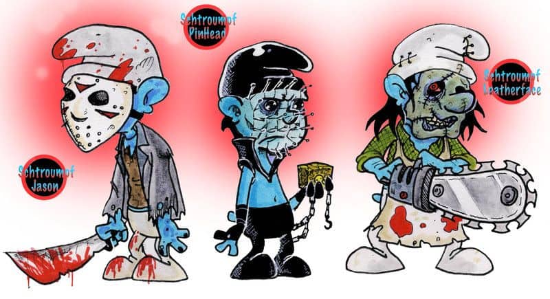 DeviantArt Nutzer Boredman hat diese grossartige Serie der Horror-Schlümpfe gezeichnet, mit dabei sind: Jason Schlumpf, Pinhead Schlumpf, Leatherface Schlumpf, Pyramid Head Schlumpf, Hannibal Schlumpf, Michael Myers Schlumpf, Jigsaw Schlumpf, Freddy Krueger Schlumpf und Ghostface Schlumpf! Schlumpfe sich wer kann!