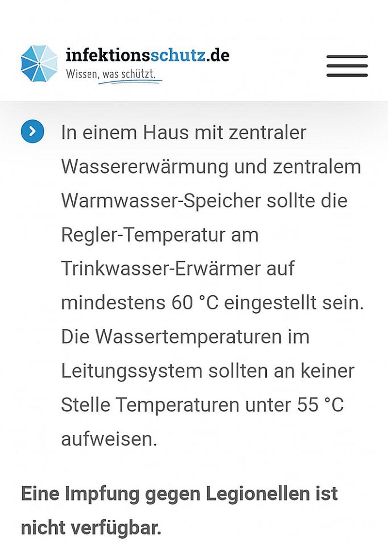 Ihr regelt das Warmwasser auf 50° und aufgrund der sich bei unter 60° in Wasserleitungen entwickelnden Legionellen regelt Darwin euch dann. Win-Win. Die Symptome decken sich in weiten Teilen übrigens mit denen einer Covid-Infektion – vielleicht gibt es dagegen auch bald was vom «Pharmazeut ihres Vertrauens». Das geht ja fix heutzutage…
