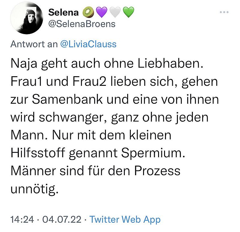 Um der Logik des Tweets zu folgen: Es geht auch ohne Frau. Mann 1 und Mann 2 lieben sich, gehen zur Adoption und bekommen ein Kind, ganz ohne Frau. Nur mit dem kleinen Hilfsstoff namens Schwangerschaft. Frauen sind für den Prozess unnötig. Der Strom kommt aus der Steckdose, das Essen aus dem Supermarkt, das Geld aus dem Geldautomat und das Sperma aus der Samenbank. Ich mach mir die Welt widewide wie sie mir gefällt…