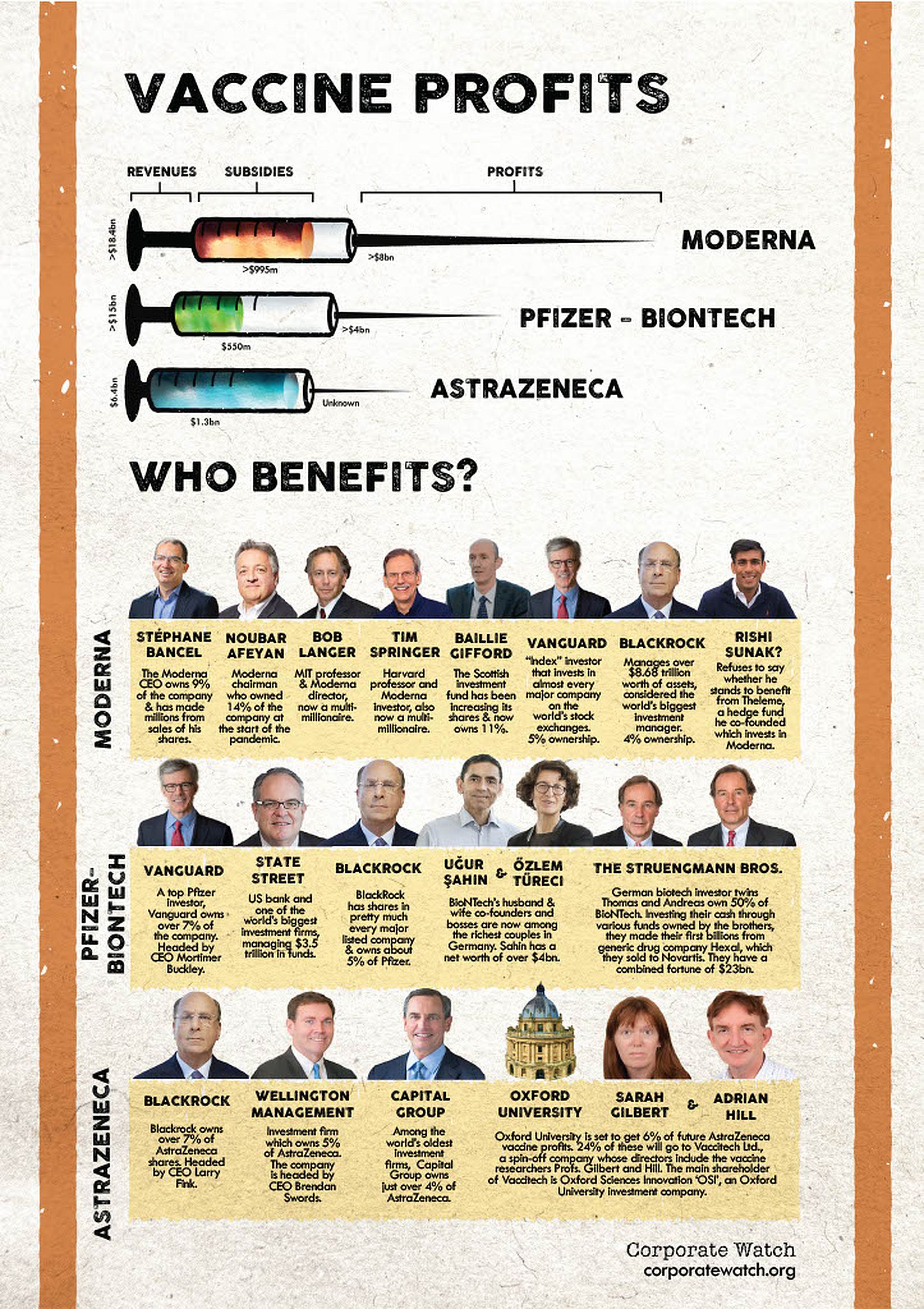 Im Folgenden betrachten wir die drei führenden Impfstoffe, die im Vereinigten Königreich und in Europa zugelassen sind: Die von BioNTech und Pfizer, von Astra Zeneca und der Universität Oxford sowie von Moderna. Wie viel Geld werden die Unternehmen, die dahinterstehen, verdienen? Wie wurden sie vom öffentlichen Sektor unterstützt? Und in wessen Taschen wird das Geld letztendlich landen?
