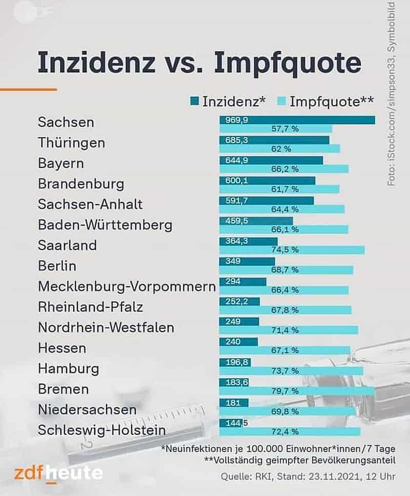 Sieht man bei diesem simplen, plumpen Diagramm genau hin, ist keine deutliche statistische Korrelation zwischen Impfquote und Inzidenzen zu entnehmen. Der einzige Trick ist, dass die Bundesländer nach Inzidenzen gereiht sind, die sich stark unterscheiden und nach unten abnehmen. Dadurch entsteht der Eindruck einer Kontinuität in der Abnahme der Inzidenzen. Allerdings zeigen die «Impfbalken» eine weitgehend diffuse Verteilung. Eine ordentliche Auswertung würde sicher keine signifikante Korrelation ergeben (geschweige denn Kausalität). Noch diffuser wäre das Bild, wenn man die Daten der ganzen Welt oder ganz Europas nehmen würde. Die Korrelation, die das ZDF hier zu fingieren versucht, gibt es nicht.