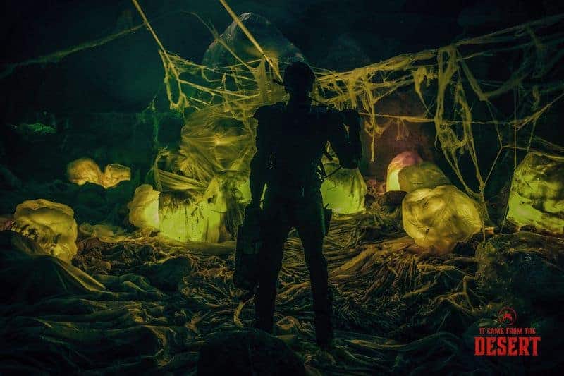 Sofern man denn überhaupt von einer Geschichte sprechen mag. Die war natürlich auch damals schon eher dünn. Was will man auch gross erzählen, wenn es um den ewigen Kampf von Mann gegen Rieseninsekt geht? Zumindest war das Spiel aber noch mit Adventureelementen versehen. Actionsequenzen gab es natürlich auch jede Menge. Dazwischen musste Dr. Bradley aber fleissig Nachforschungen betreiben, um überhaupt zu den Ameisen zu gelangen. Mit dem Echtzeitablauf und den verschiedenen Enden war «It Came from the Desert» angesichts des Themas sogar erstaunlich ambitioniert. Der Film ist das aber nicht und gross nachdenken soll hier wirklich niemand. Stattdessen wollen der finnische Regisseur Marko Mäkilaakso (War of the Dead) und sein Co-Autor Trent Haaga (Cheap Thrills, 68 Kills) vor allem eins: Spass haben. Die trashigen Wurzeln wurden herausgeputzt und ganz stolz in den Vordergrund gestellt. Da wird geschossen und gehackt, gemetzelt und gefressen. Richtig viel Spannung entsteht dabei nicht, soll aber auch gar nicht. Die riesigen Ameisen sind weniger Stoff für Albträume als vielmehr für gesellige Videoabende. Hier darf gegrölt werden, wenn die Viecher miteinander kommunizieren und Jagd auf Jugendliche machen, die ihnen körperlich wie intellektuell unterlegen sind.