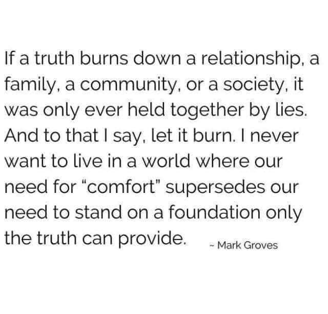 If a truth burns down a relationship, a family, a community, or a society, it was only ever held together by lies. And to that I say, let it burn. I never want to live in a world where our need for «comfort» supersedes our need to stand on a foundation only the truth can provide.