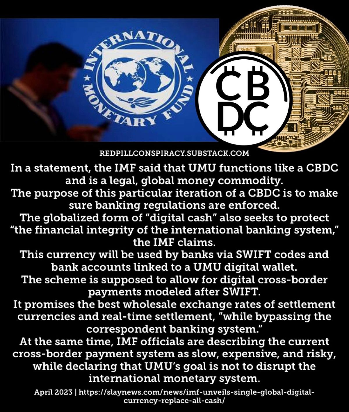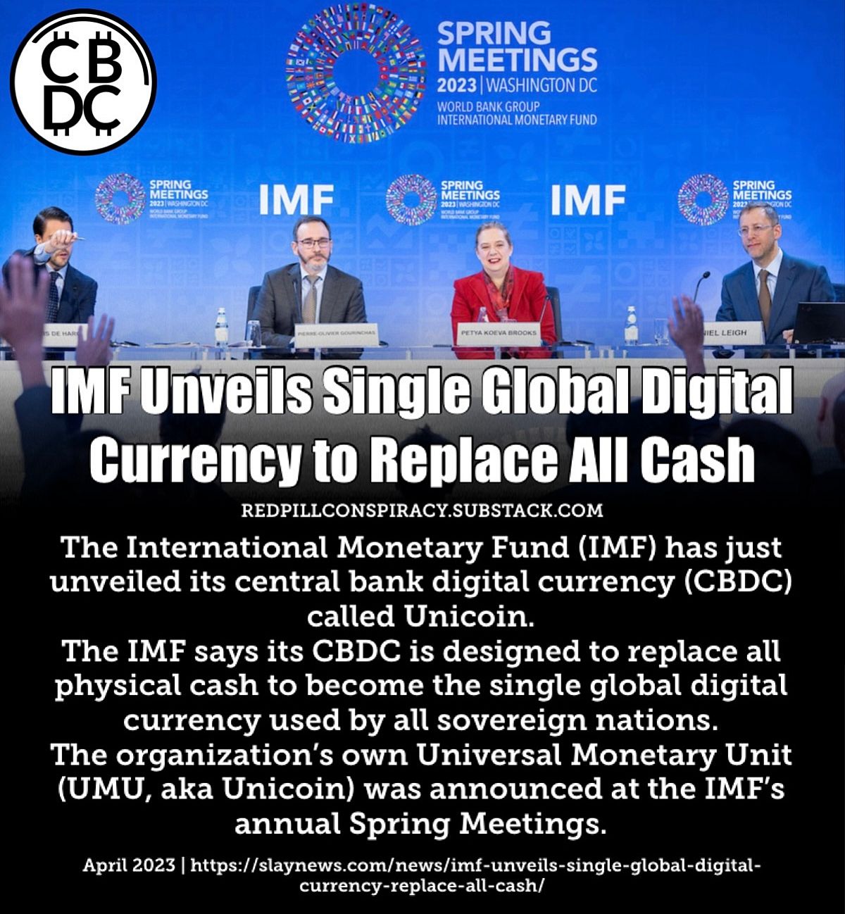 Und schon wird die nächste «Verschwörungstheorie» zur Realität: Der Internationale Währungsfonds (IWF) hat soeben seine Digitales Zentralbankengeld (CBDC) namens Unicoin vorgestellt. Der IWF sagt, sein CBDC soll alles physische Bargeld ersetzen, um die einzige globale digitale Währung zu werden, die von allen souveränen Nationen verwendet wird. Die organisationseigene Universal Monetary Unit (UMU, auch bekannt als Unicoin) wurde auf der jährlichen Frühjahrstagung des IWF im April 2023 angekündigt.