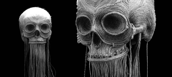 Jim Crane macht Skulls aus Schnüren. Die Dinger erinnern zwar ab und zu eher an Schrumpfköpfe und Spaghetti…