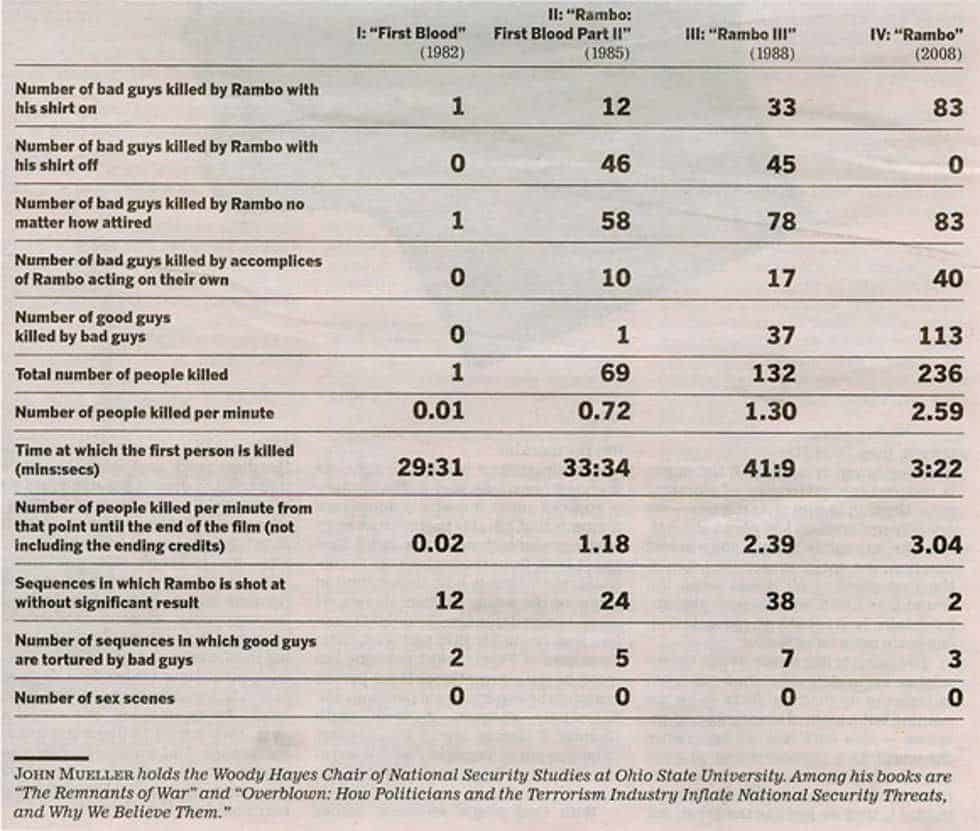 Naja, wenn man der nachfolgenden Statistik glauben schenken darf, klingt nach Anzahl der Opfer der neuste Rambo am vielversprechensten. Total 236 Leichen werden durch den neusten Totalschlag von Sly gezeigt, das ergibt 2.59 pro Minute des Films. Beim neusten Rambo Film gehts auch deutlich schneller zur Sache: Musste man bei Teil 1 und 2 eine geschlagene halbe Stunde, bei Teil 3 gar 40 Minuten warten, wird bei John Rambo gleich nach 3 Minuten und 22 Sekunden mit den ersten Toten losgelegt…