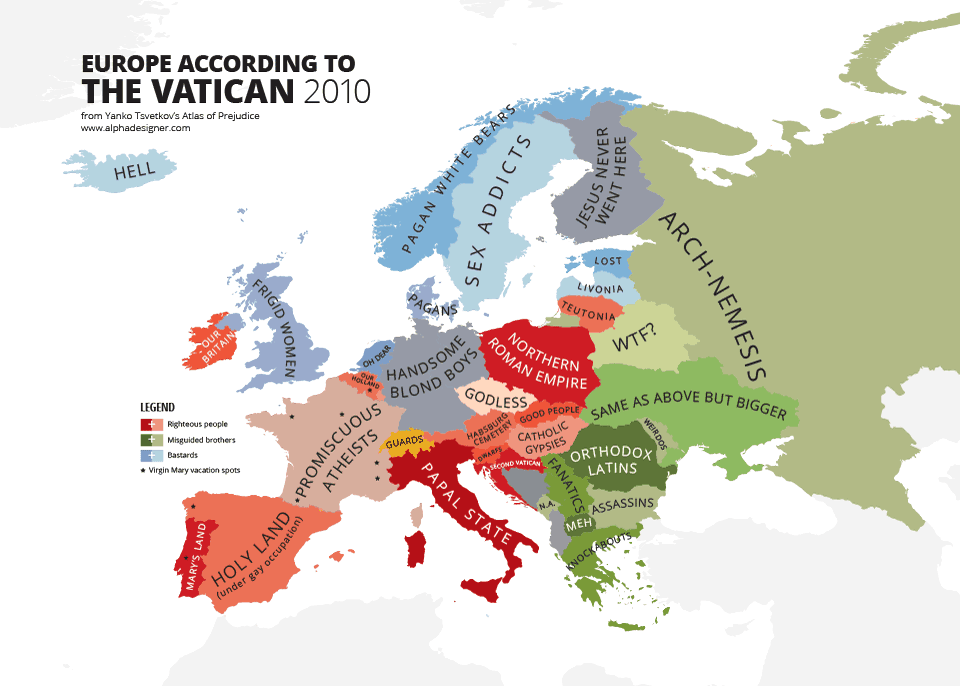 Designer Yanko Tsvetkov konzentriert sich auf Karten aus unterschiedlichen Länderperspektiven. Schwerpunkt: Vorurteile. Den «Atlas of Prejudice«, der manchmal lustig, manchmal verstörend ist, gibts für € 16.95 und beinhaltet über 40 Exemplare dieser Karten. Nachfolgend präsentieren wir ein paar unserer Favoriten:
