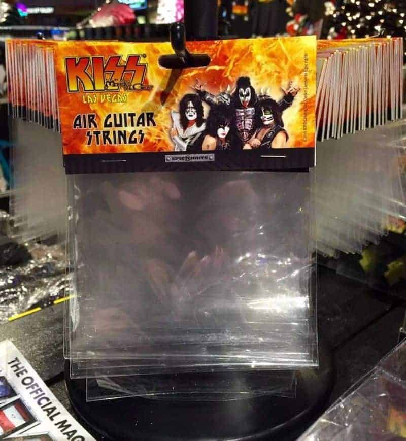 Freunde, seid ihr KISS Fan? Dann gibt es für euch nun das ultimative Merch! Kiss verkaufen an ihre Hardcore-Fans Saiten für Luftgitarren. Das bisschen Plastik mit Luft kostet dabei nur $3.99 und ist billiger als echte Saiten. Am Ende allerdings keine Alternative. Keine Ahnung, wer so etwas kauft.
