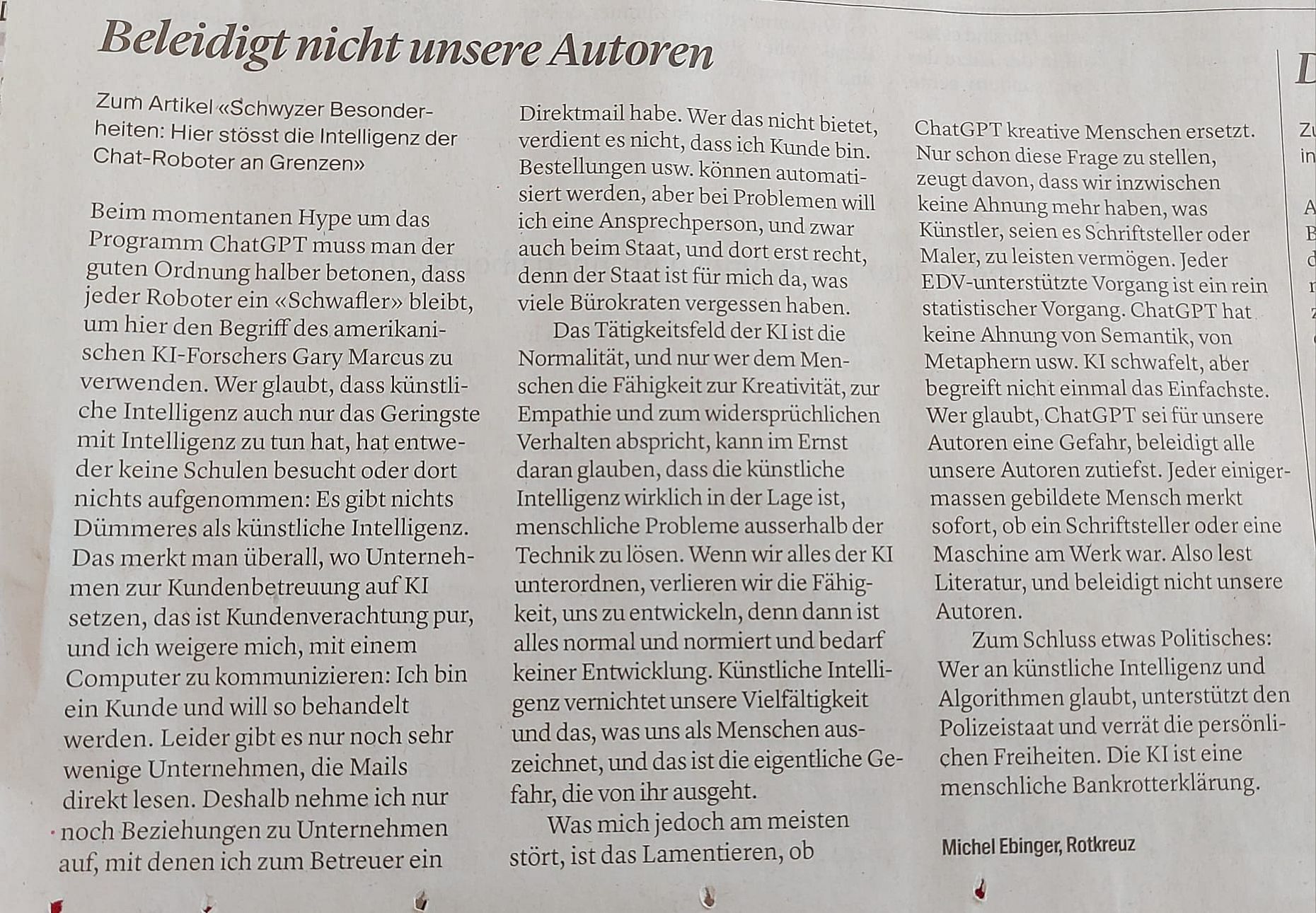 Beim momentanen Hype um das Programm ChatGPT muss man der guten Ordnung halber betonen, dass jeder Roboter ein «Schwafler» bleibt, um hier den Begriff des amerikanischen KI-Forschers Gary Marcus zu verwenden. Wer glaubt, dass künstliche Intelligenz auch nur das Geringste mit Intelligenz zu tun hat, hat entweder keine Schulen besucht oder dort nichts aufgenommen: Es gibt nichts Dümmeres als künstliche Intelligenz. Das merkt man überall, wo Unternehmen zur Kundenbetreuung auf KI setzen, das ist Kundenverachtung pur und ich weigere mich, mit einem Computer zu kommunizieren: Ich bin ein Kunde und will so behandelt werden. Leider gibt es nur noch sehr wenige Unternehmen, die Mails direkt lesen. Deshalb nehme ich nur noch Beziehungen zu Unternehmen auf, mit denen ich zum Betreuer ein Direktmail habe. Wer das nicht bietet verdient es nicht, dass ich Kunde bin.