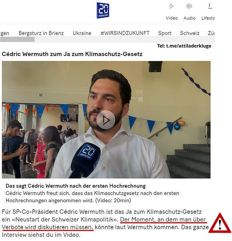 SP CO-Präsident Cédric Wermuth ist hocherfreut, dass das Klima»schutz»-Gesetz angenommen wurde und denkt vor laufender Kamera schon einmal über mögliche Verbote nach, um die gesetzlich vorgegebenen Klimaziele erzwingen zu können. Entgegen allen Versprechungen im Wahlkampf werden Verbote kommen und zwar schneller als uns lieb ist, das ist für mich so sicher wieder wie das Amen in der Kirche.