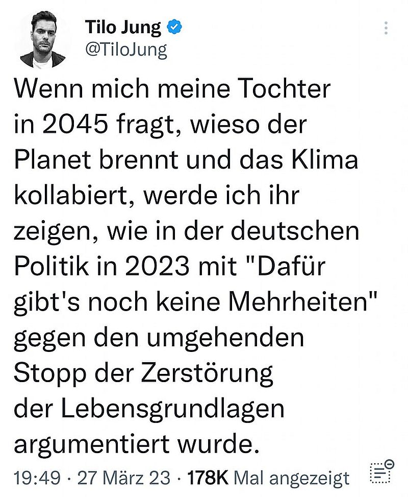 Warum sollte der Planet brennen und wie stellt sich das „kollabierte“ Klima dar? Klima ist Wandel – warum also verdammt nochmal habt ihr Kinder gezeugt?! Etwa voll der Überzeugung, ihr werdet das Kind schon schaukeln, indem ihr am Teelicht-Ofen hockt, Lastenrad fahrt, in den Wald scheisst, Grillen fresst, die Natur mit Windmühlen und Glas zupflastert, mit rationiertem Strom eure Wäsche wascht, alle zwei Tage 5 Minuten lauwarm duscht und eure Hütte für 200’000€ saniert? Eventuell stellt dir deine Tochter 2045 überhaupt keine Fragen, weil vielleicht irgendwann der Blinddarm akut ziept und der Rettungswagen nicht weiterkommt, weil da vorne der Raúl mal wieder seine Griffel auf die Strasse betoniert hat. Ja leck mich doch am Arsch, Tilo!