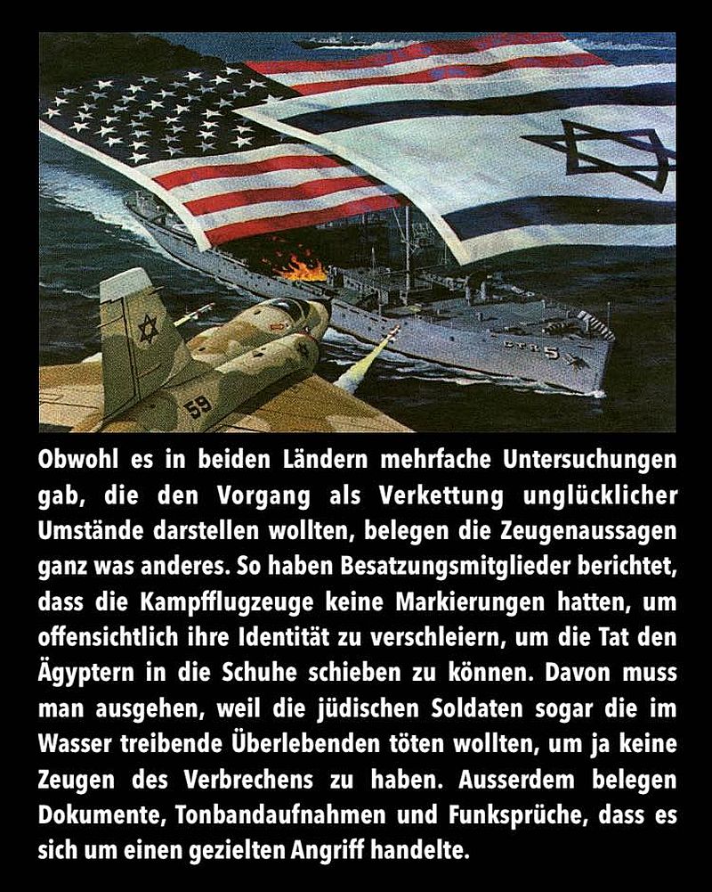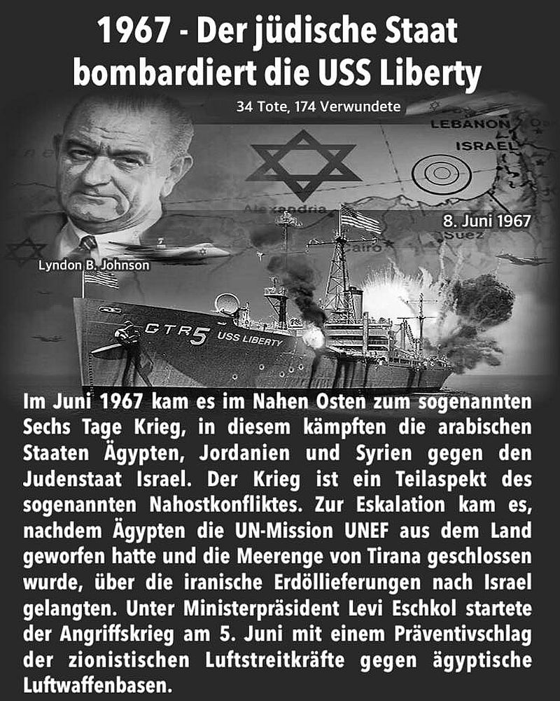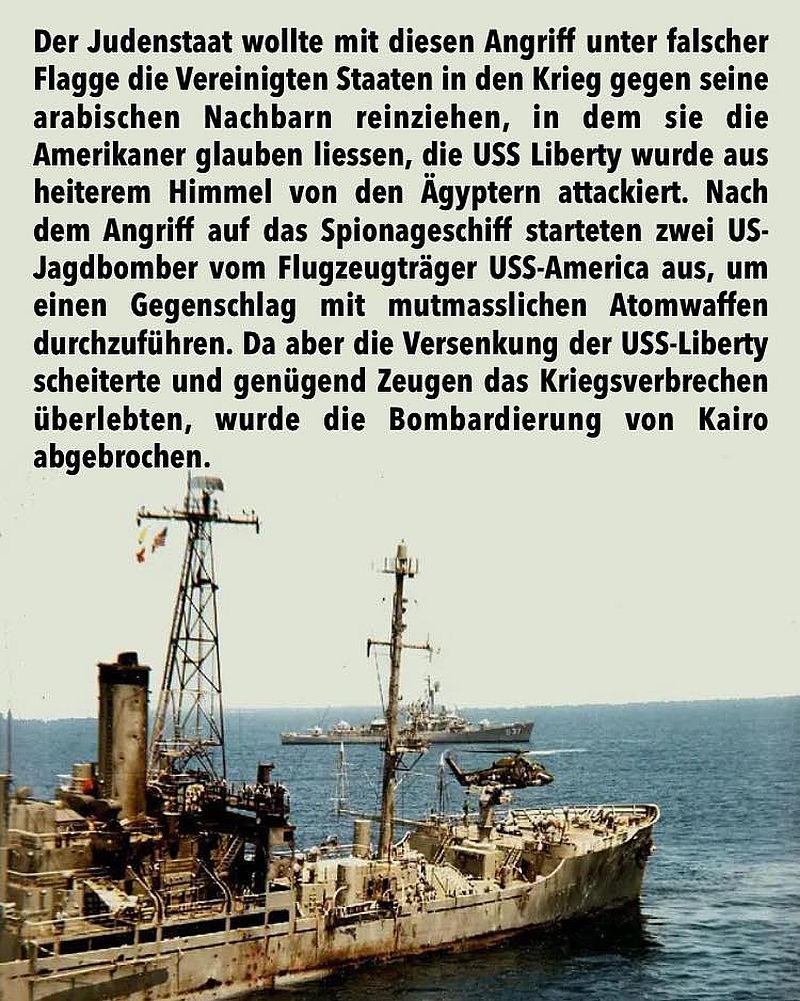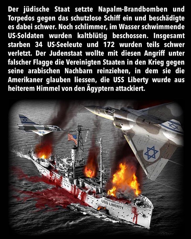 Der jüdische Staat setzte Napalm-Brandbomben und Torpedos gegen das schutzlose Schiff ein und beschädigte es dabei schwer. Noch schlimmer, im Wasser schwimmende US-Soldaten wurden kaltblütig beschossen. Insgesamt starben 34 US-Seeleute und 172 wurden teils schwer verletzt. Der Judenstaat wollte mit diesem Angriff unter falscher Flagge die Vereinigten Staaten in den Krieg gegen seine arabischen Nachbarn reinziehen, in dem sie die Amerikaner glauben liessen, die USS Liberty wurde aus heiterem Himmel von den Ägyptern attackiert.