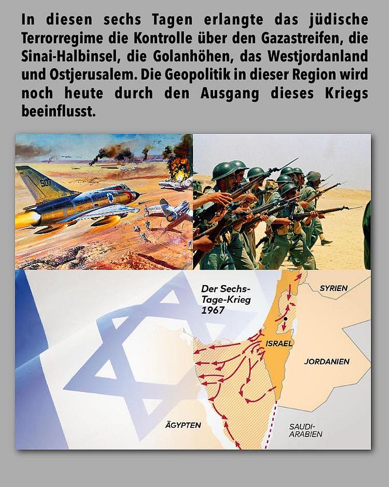 In diesen sechs Tagen erlangte das jüdische Terrorregime die Kontrolle über den Gazastreifen, die Sinai-Halbinsel, die Golanhöhen, das Westjordanland und Ostjerusalem. Die Geopolitik in dieser Region wird noch heute durch den Ausgang dieses Kriegs beeinflusst.