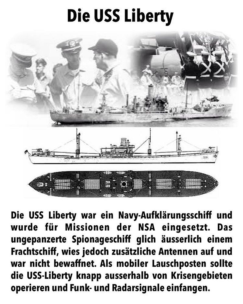 Die USS Liberty war ein Nawy-Aufklärungsschiff und wurde für Missionen der NSA eingesetzt. Das ungepanzerte Spionageschiff glich äusserlich einem Frachtschiff, wies jedoch zusätzliche Antennen auf und war nicht bewaffnet. Als mobiler Lauschposten sollte die US$-Liberty knapp ausserhalb von Krisengebieten operieren und Funk- und Radarsignale einfangen.