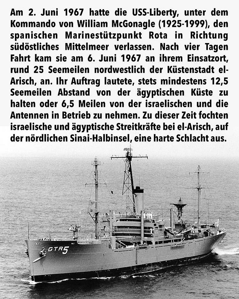 Am 2. Juni 1967 hatte die USS-Liberty, unter dem Kommando von William McGonagle (1925-1999), den spanischen Marinestützpunkt Rota in Richtung südöstliches Mittelmeer verlassen. Nach vier Tagen Fahrt kam sie am 6. Juni 1967 an ihrem Einsatzort, rund 25 Seemeilen nordwestlich der Küstenstadt el-Arisch, an. Ihr Auftrag lautete, stets mindestens 12,5 Seemeilen Abstand von der ägyptischen Küste zu halten oder 6,5 Meilen von der israelischen und die Antennen in Betrieb zu nehmen. Zu dieser Zeit fochten israelische und ägyptische Streitkräfte bei el-Arisch, auf der nördlichen Sinai-Halbinsel, eine harte Schlacht aus.
